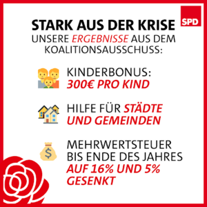 Von „beispielhaften Ergebnissen“ sprach auch SPD-Chef Norbert Walter-Borjans. Denn allein die Mehrwertsteuersenkung werde die Verbraucherinnen und Verbraucher um rund 20 Milliarden Euro entlasten. Vom 1. Juli 2020 bis Ende des Jahres wird die Mehrwertsteuer von 19 auf 16 % sinken, beim ermäßigten Satz werden es statt 7 nun 5 % sein. Hinzu kommt für Familien ein Kinderbonus von 300 Euro für jedes Kind. Dafür hatte sich die SPD schon im Vorfeld stark gemacht.